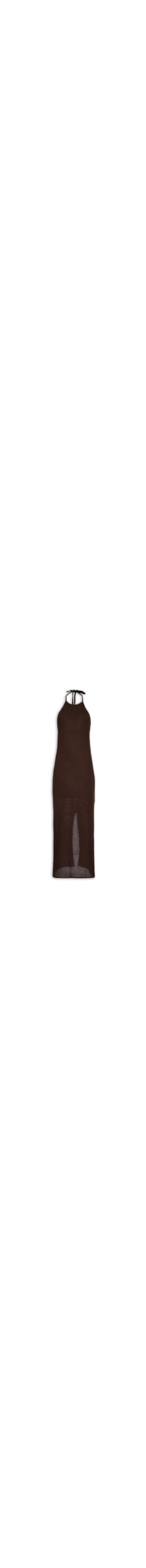 O vestido marrom é confeccionado em tricot com média elasticidade. A peça solta ao corpo modelo frente única possui decote trapézio com fechamento posterior por amarração, abertura posterior, fenda posterior, meio forro e comprimento longo.