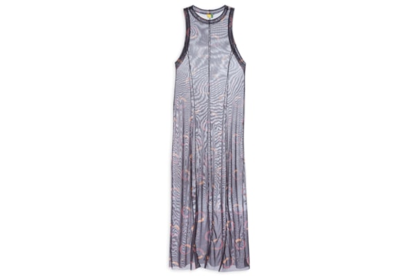O vestido preto é confeccionado em tecido leve com baixa elasticidade. A peça justa no busto e solta no corpo possui decote coração, alças finas reguláveis, busto com recortes frontais com detalhes de drapeado e aro embutido para sustentação, recortes frontais e posteriores com detalhes de franzidos na altura da cintura, recorte posterior com lastex embutido, estampa geométrica em cores contrastantes e comprimento longo.