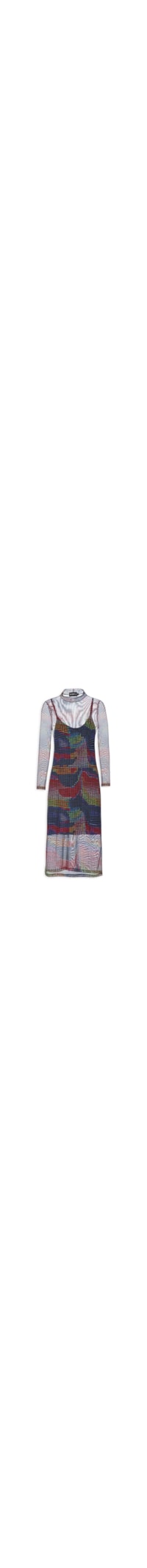 O vestido preto é confeccionado em tule com alta elasticidade. A peça justa ao corpo possui gola alta, mangas longas, transparência, estampa em cor contrastante, forro e comprimento midi.