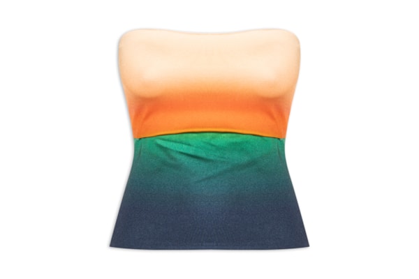 O vestido amarelo é confeccionado em tule com alta elasticidade. A justa ao corpo possui decote redondo, alças médias, cavas regulares, recorte frontal assimétrico com franzidos, efeito degradê em cores contrastantes, forro, transparência e comprimento midi.