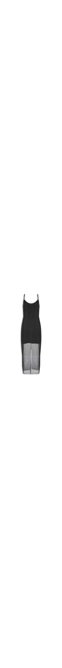 O vestido preto é confeccionado em tule com alta elasticidade. A peça solta ao corpo possui decote posterior e frontal em U, alças finas, meio forro, fenda posterior, transparência e comprimento midi.