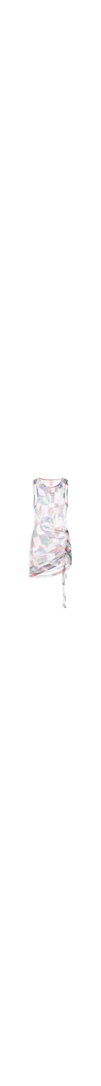 O vestido azul é confeccionado em tule com alta elasticidade. A peça justa ao corpo possui decote frontal redondo, alças médias, cavas regulares, mix de estampas geométricas, leve transparência e comprimento curto.