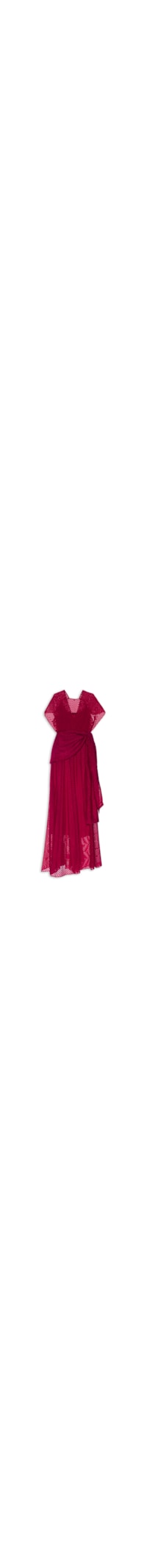 O vestido vermelho é confeccionado em seda mista com superfície texturizada sem elasticidade. A peça solta ao corpo possui decote em V transpassado, mangas curtas com detalhe de franzido na parte posterior, cavas estendidas, detalhes de franzido na cintura, recorte sobreposto na cintura com faixas estendidas para amarração lateral, forro fixo com alças finas, tag da marca na parte posterior, comprimento longo e fechamento lateral por zíper.
