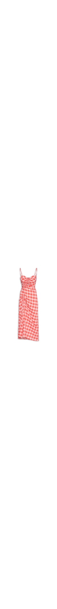 O vestido vermelho é confeccionado em tecido leve baixa elasticidade. A peca justa no busto e solta no comprimento possui decote coração com efeito franzido, padronagem xadrez, alças finas reguláveis, lástex embutido no decote posterior, recorte frontal embutido por cordão, fenda frontal embutido por amarração, forro e comprimento midi.